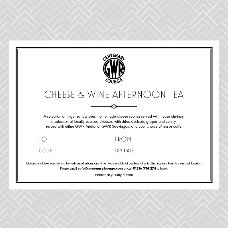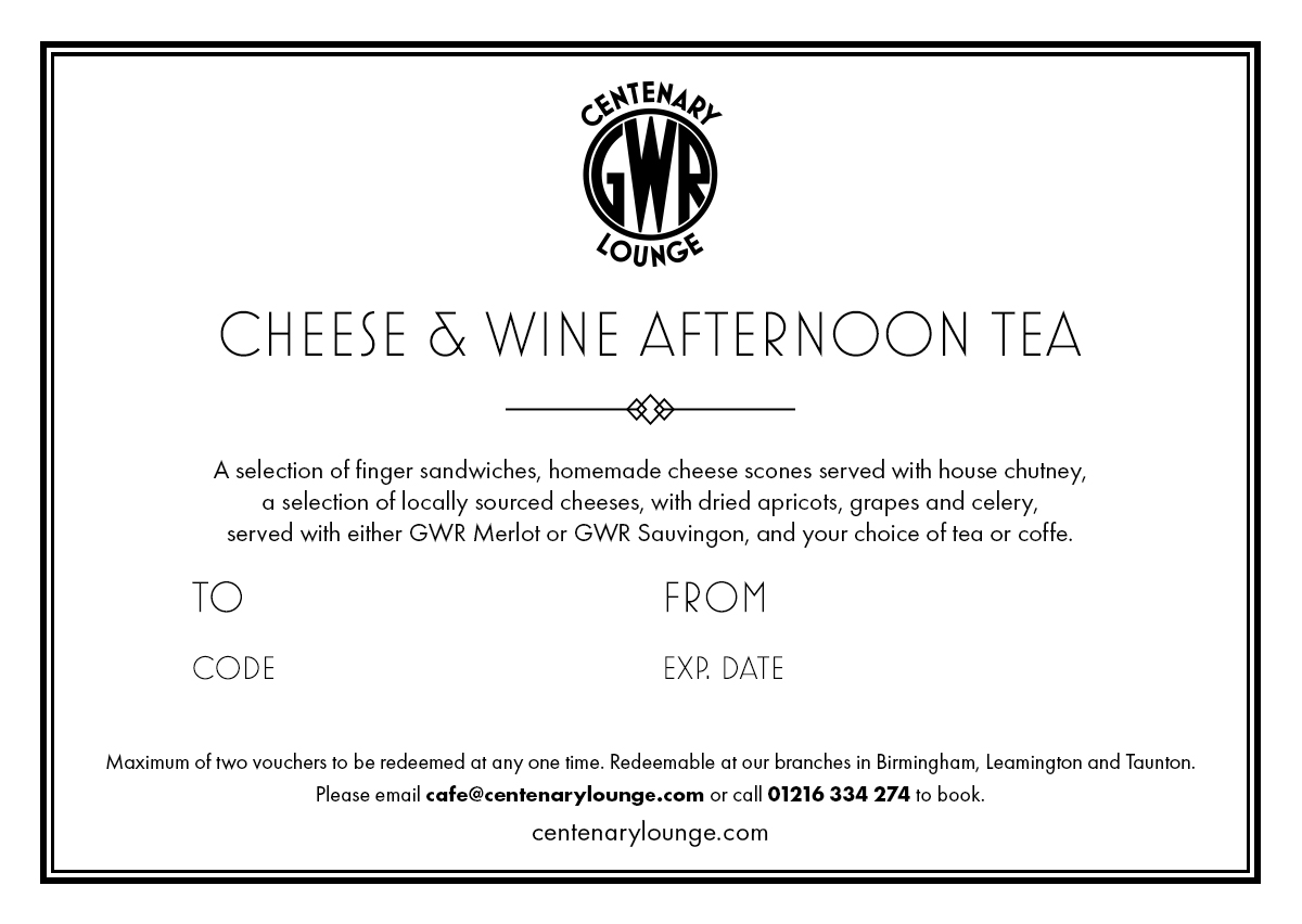 A selection of finger sandwiches, homemade cheese scones served with house chutney, a selection of locally sourced cheeses, with dried apricots, grapes and celery. Served with either a GWR Merlot, or GWR Sauvingon, and your choice of tea or coffee. Why not give us a call on 01216 334 274 or drop us an email to enquire further.