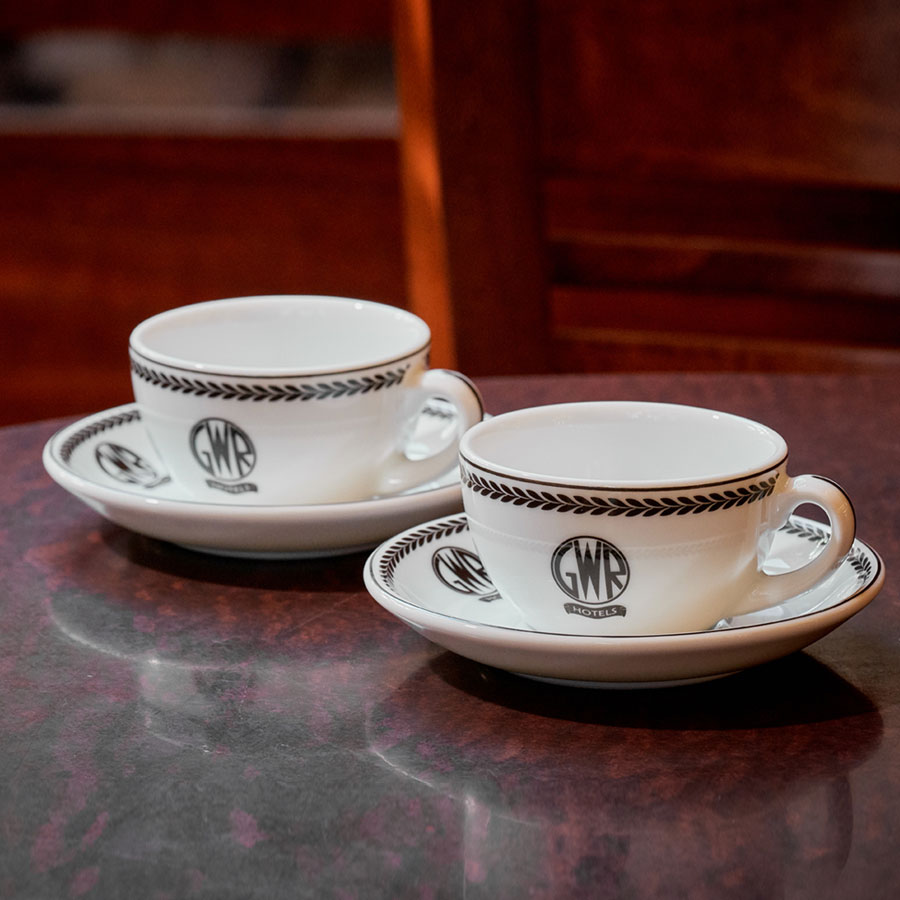 A pair of espresso cups with saucers decorated with the stunning familiar black leaf pattern and the iconic GWR roundel of the 1930s. A must for coffee lovers.